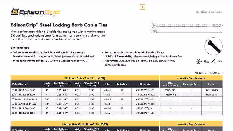EdisonGrip™ cable ties are evaluated and listed to recognized international standards, including UL 62275 (cULus), EN 62275, and RoHS/REACH compliance. Certification details are provided per product.